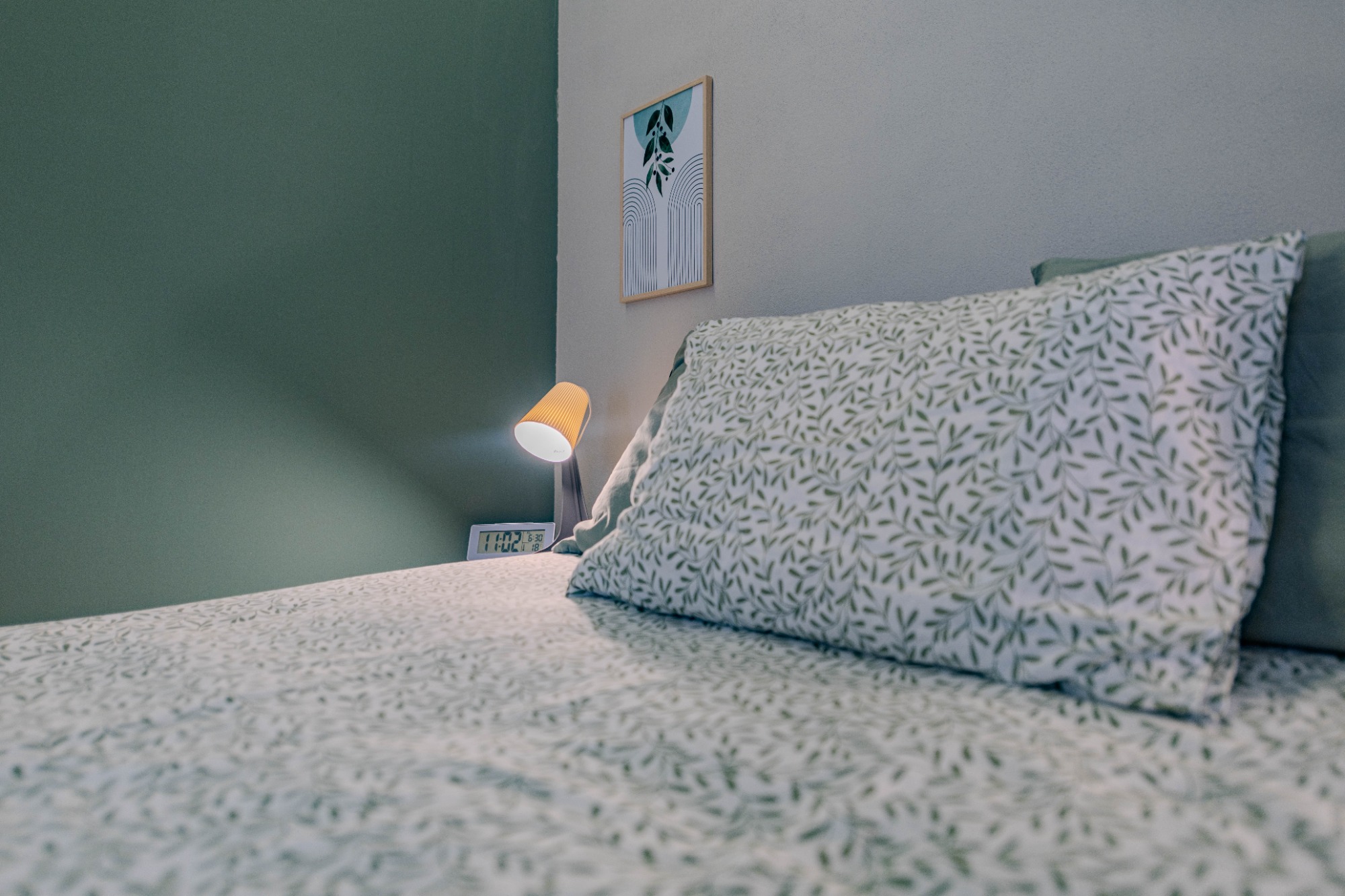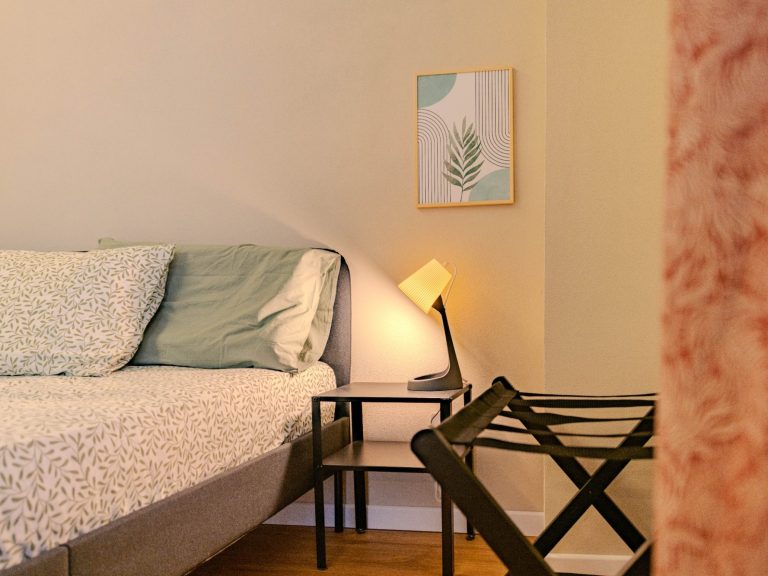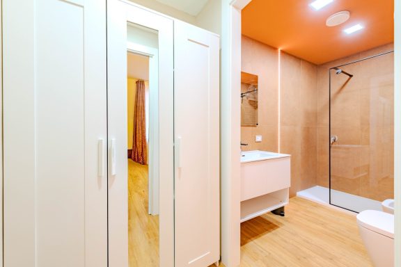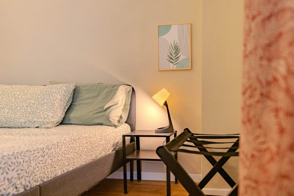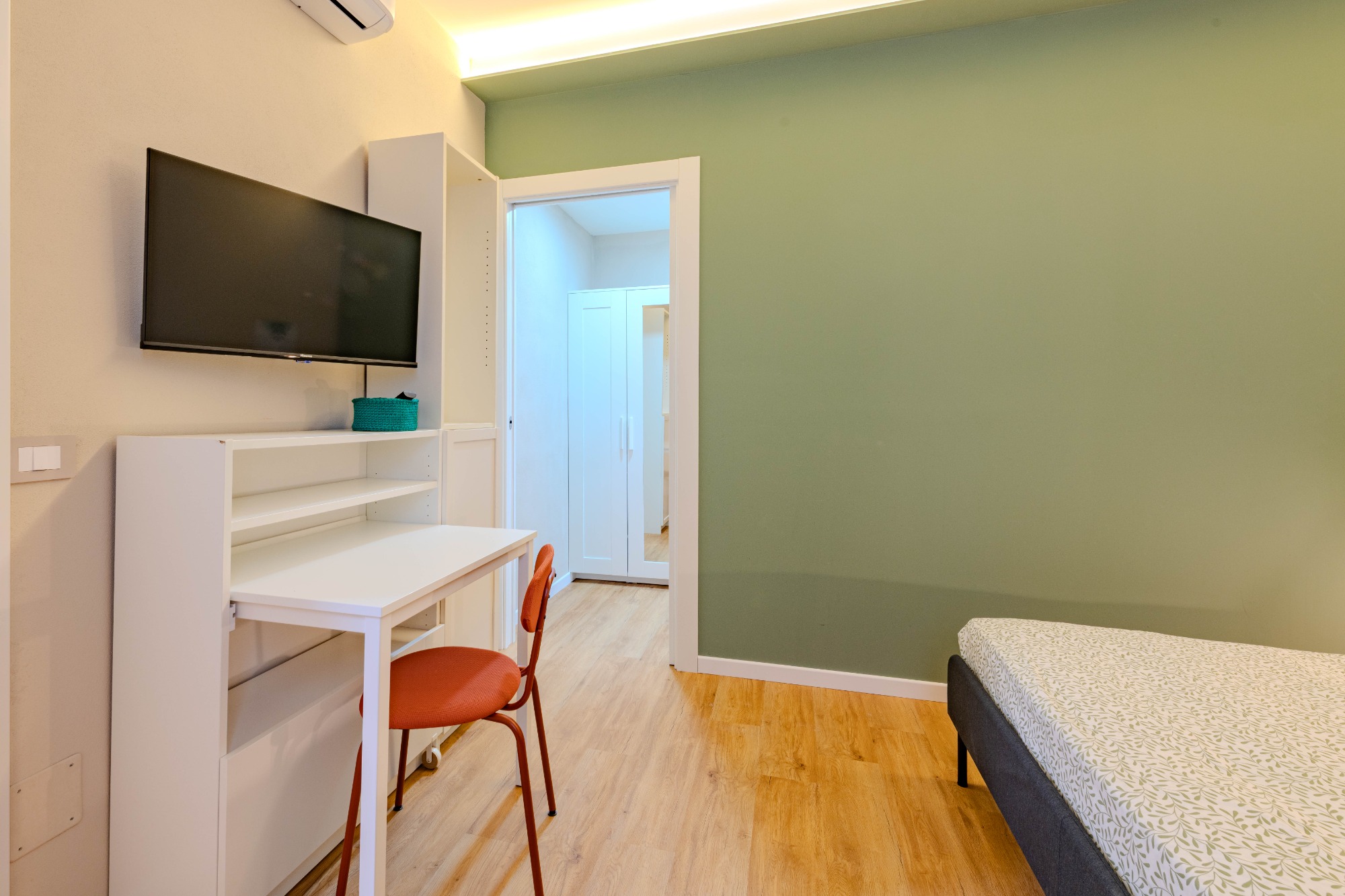 La stanza è definita da colori delicati, luci studiate con cura e arredi essenziali pensati per creare un ambiente ordinato, equilibrato e naturalmente elegante. Il letto matrimoniale offre un comfort avvolgente, mentre la scrivania e l’angolo guardaroba rendono la camera perfetta anche per chi viaggia per studio o lavoro.